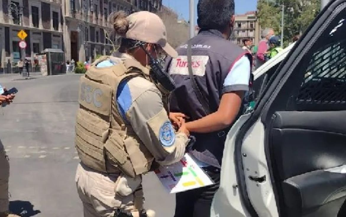 Ciudad de México.- Elementos de la Secretaría de Seguridad Ciudadana (SSC), detuvieron a dos hombres que se identificaron como prestadores de servicios del Turibús, en el Zócalo, sin contar con el permiso correspondiente.
