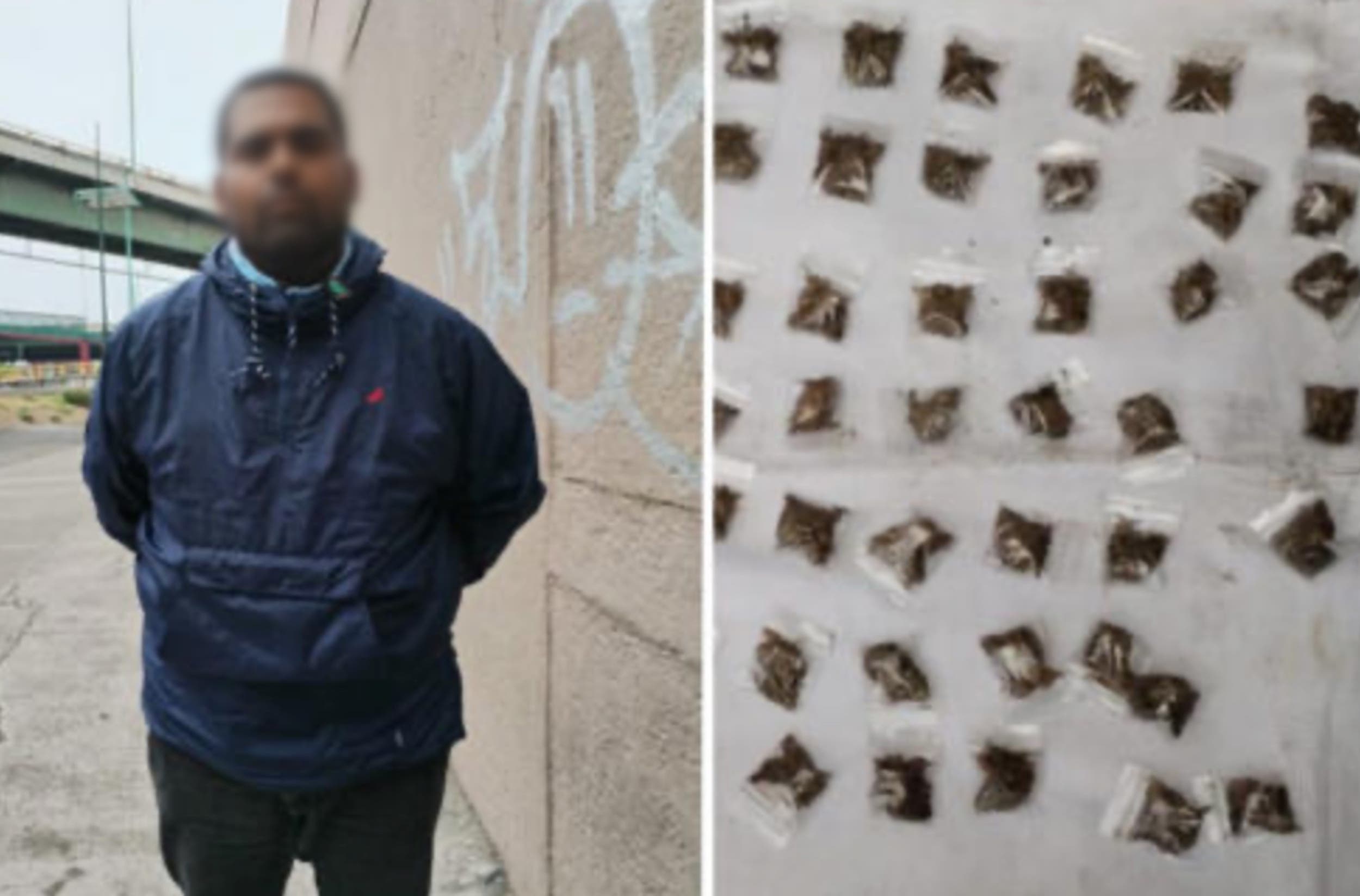 Durante un patrullaje por la calle de Transval, los agentes observaron a un individuo conduciendo una motoneta de color azul, quien levantó sospechas al llevar consigo envoltorios de marihuana. Al realizar la revisión correspondiente, se encontraron 51 bolsitas de marihuana y 39 más que contenían cocaína en posesión del sujeto.