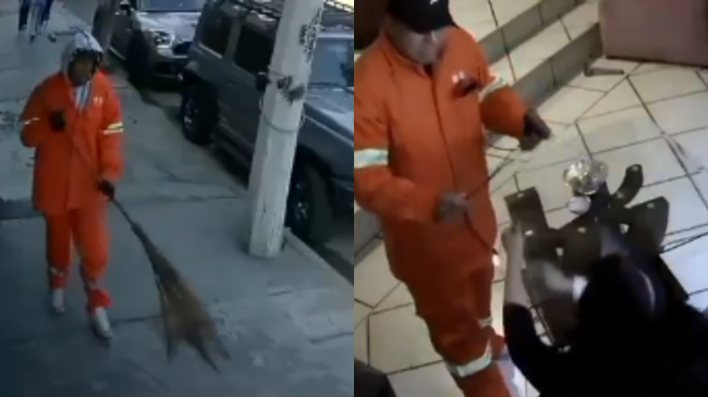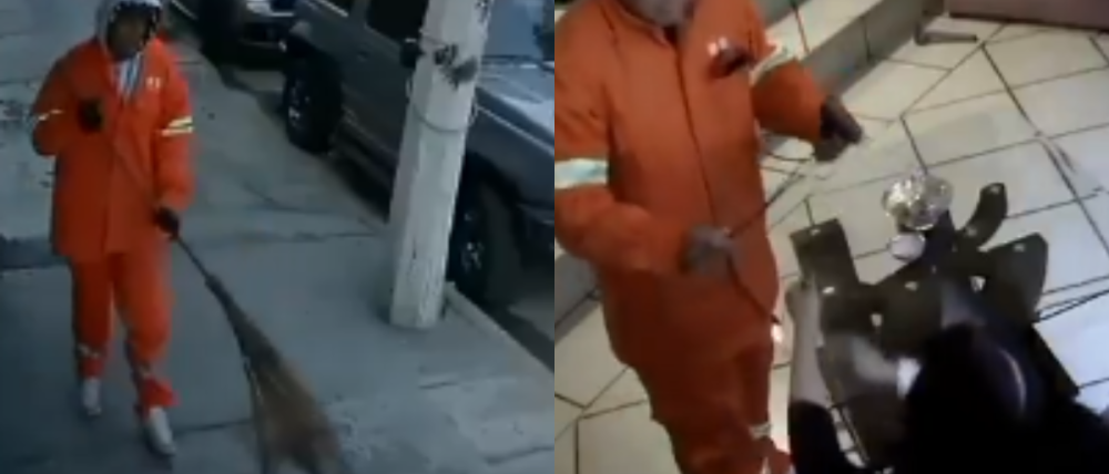 En las grabaciones se observa cómo los supuestos trabajadores fingían barrer la banqueta y realizar labores de mantenimiento: