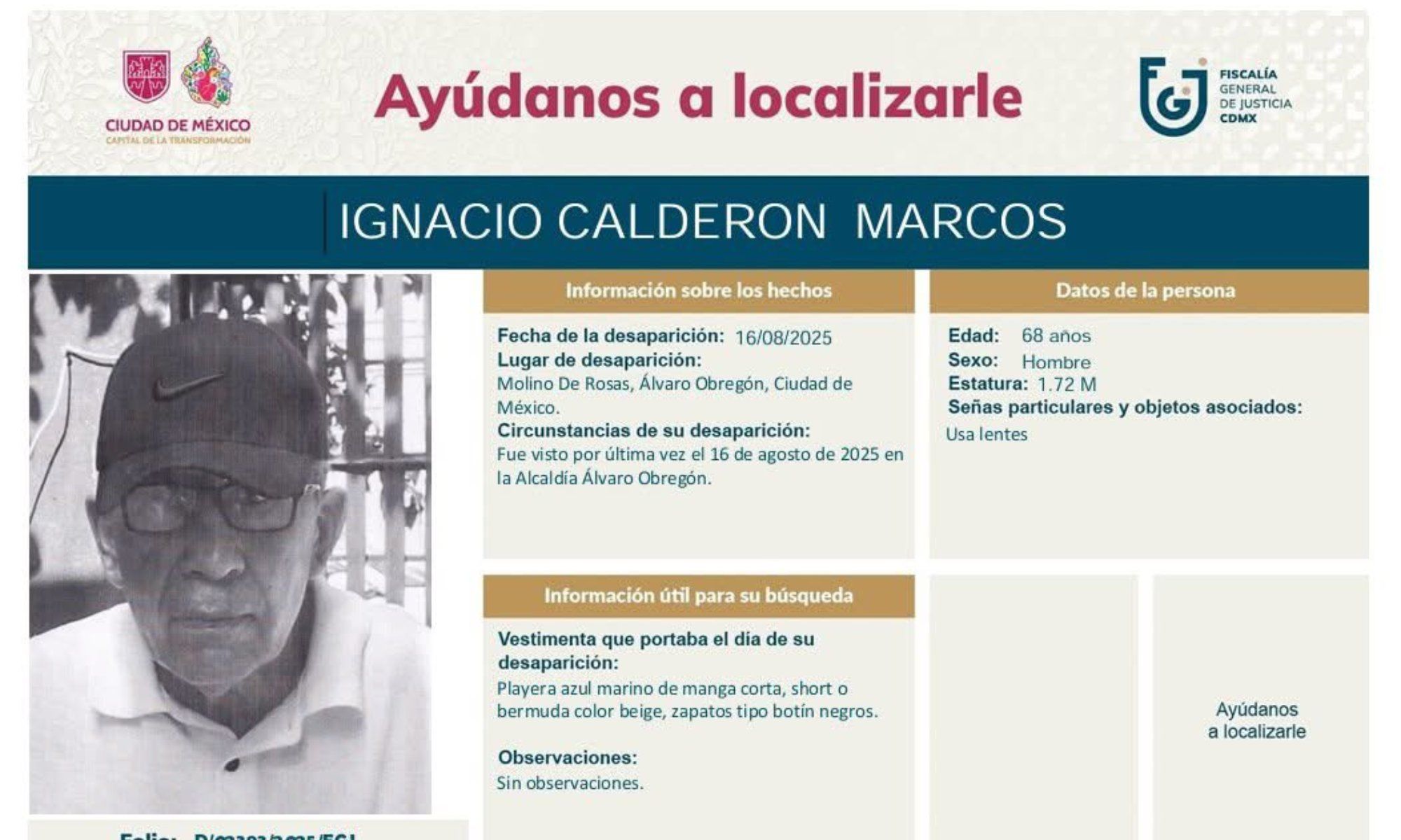Con base en los registros de la Fiscalía, el protocolo de búsqueda se encontraba activo desde hace tiempo, dado que el hombre fue visto por última vez hace ocho meses cuando salió de su domicilio acompañado de su perro.