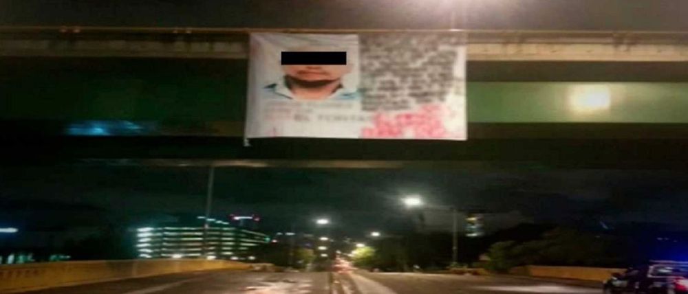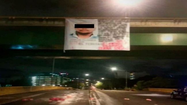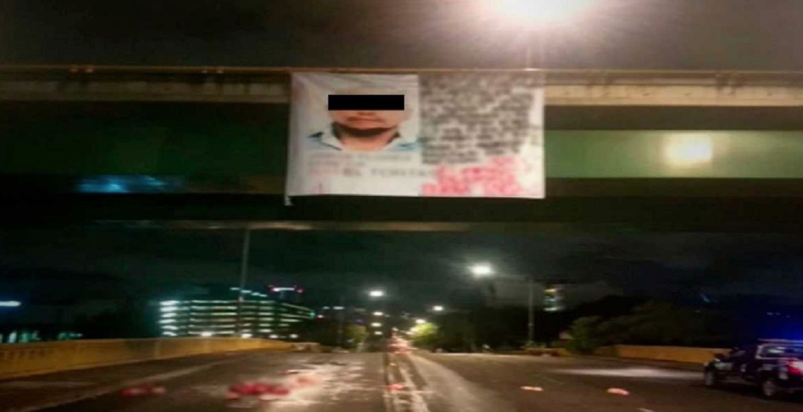 Cuerpos desmembrados y regados de bajo de una narcomanta colgada en un puente en Av de Los Insurgentes y Flores Magon.