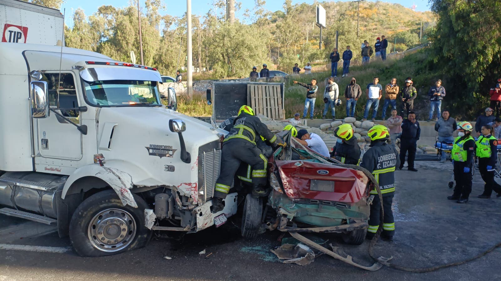 Hombre queda prensado tras choque entre tráiler y auto en la México- Querétaro