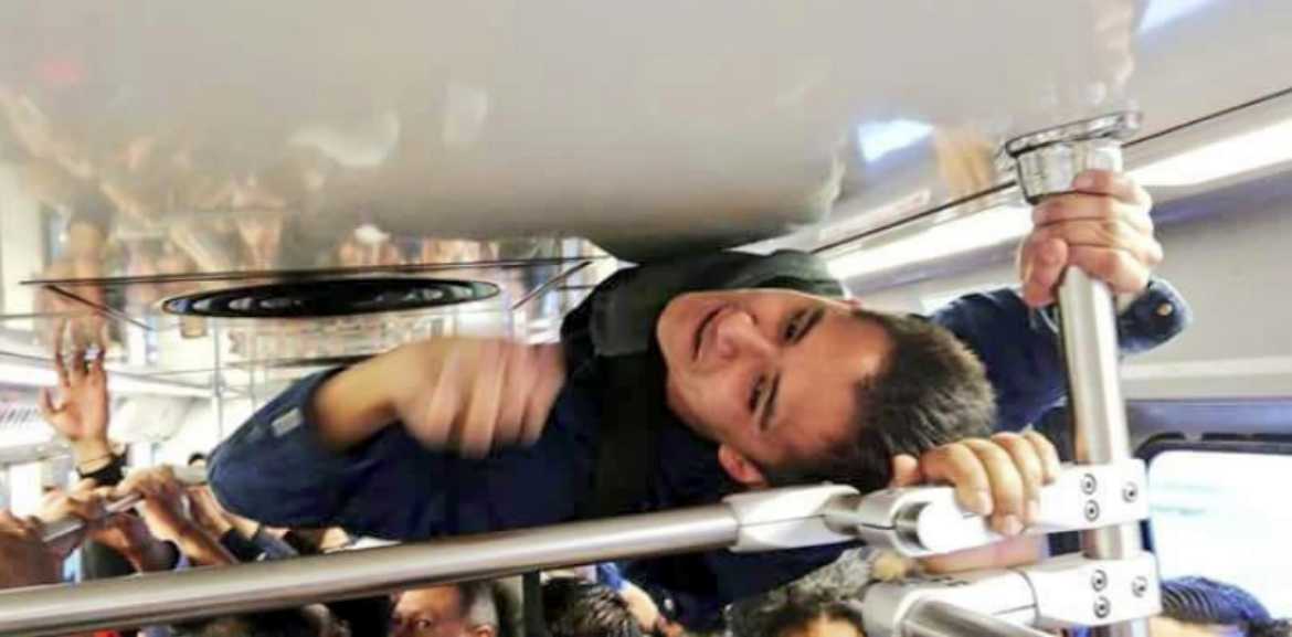 Pero sin duda lo que este usuario realizó en la mañana de este jueves, formará parte de las “historias increíbles” en el Metro, debido a que se colgó de los pasamanos y se acostó cerca del techo del tren, ya que el vagón iba muy lleno y vio la parte de arriba como la mejor opción para trasladarse a su trabajo.