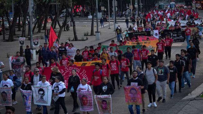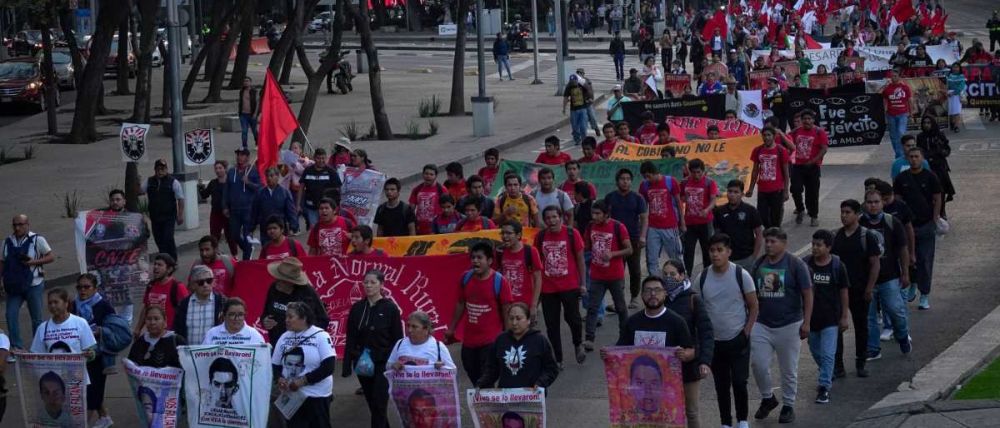La tarde de este sábado, familiares, activistas y estudiantes realizaron una marcha sobre Paseo de la Reforma en la Ciudad de México para exigir justicia, tras más de diez años de la desaparición forzada de 43 estudiantes de Ayotzinapa.