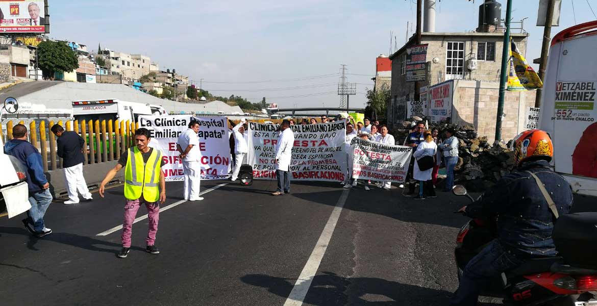 Ciudad de México.- Desde las 6:00 horas de este lunes, médicos y enfermeras del Hospital Emiliano Zapata bloquean la Autopista México-Puebla rumbo a la Ciudad de México en demanda de mejores sueldos, más insumos para atender a la gente y que no se vendan plazas.