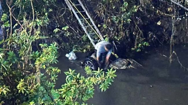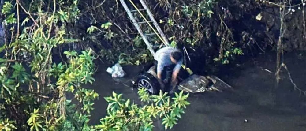 El vehículo involucrado, un Renault Kwid, volcó tras una intensa lluvia y quedó con las llantas hacia arriba dentro del canal.