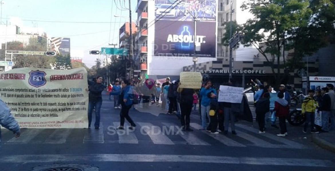 El tránsito vehicular del Eje 3 Baja California, en el cruce con Eje 2 Poniente Monterrey, en la colonia Roma Sur, de la delegación Cuauhtémoc, permaneció bloqueado a causa de una manifestación que realizaron padres de familias y niños de la primaria “21 de Marzo”.