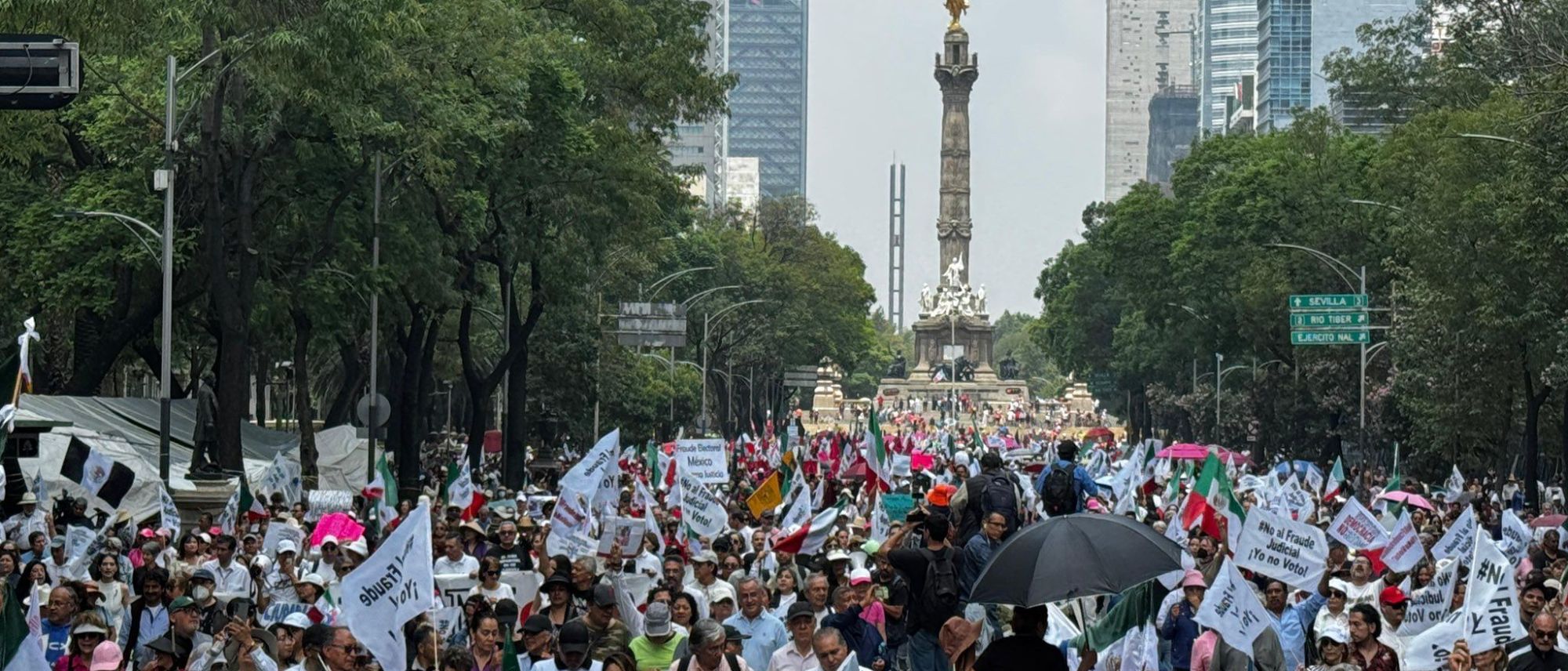 El contingente, en su mayoría portando la bandera mexicana y pancartas con la palabra "democracia", avanzó por Paseo de la Reforma. Fernando Belauzaran, integrante del colectivo Somos México, insistió en que la ciudadanía no debería votar este domingo, argumentando que "se estaría apoyando un fraude electoral y la muerte de la democracia".