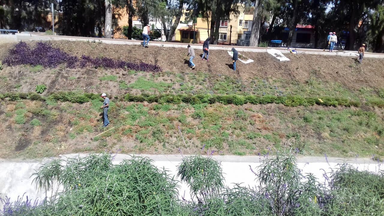 Como parte de la rehabilitación ambiental que comprende el tramo de Río Churubusco a La Viga, se realiza también el desyerbe de talud interior y exterior del Canal, donde los residuos orgánicos obtenidos son integrados a zanjas y zonas que presentan erosión.