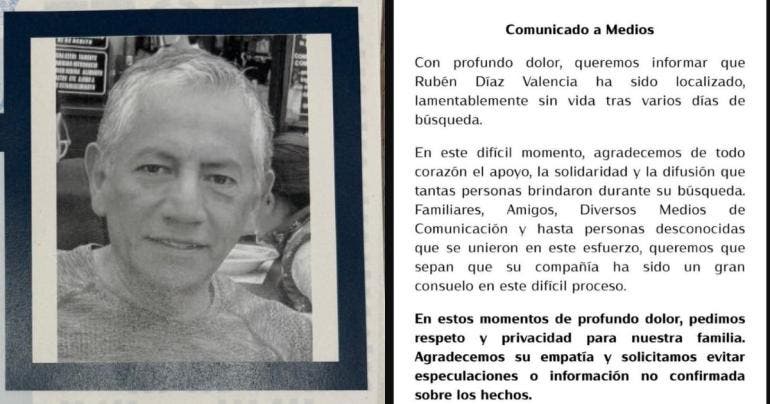 La familia de Rubén Díaz Valencia confirmó su fallecimiento este 30 de enero, tras varios días de búsqueda. El hombre, de 62 años, fue encontrado sin vida en la carretera Picacho-Ajusco, luego de haber sido reportado como desaparecido desde hace días.