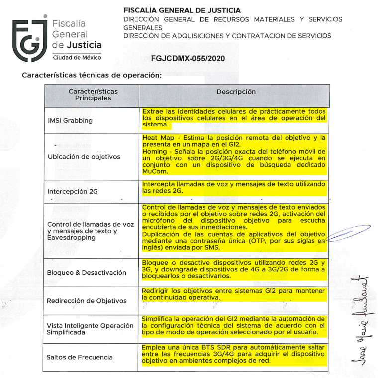 Entre las cláusulas de los anexos de este contrato se estipula que la empresa debe “guardar indefinidamente absoluta confidencialidad que se derive de la adquisición de tres sistemas de radiolocalización”. Además, en el mismo contrato se estipula que el proveedor debía hacer una “transferencia de conocimientos” a través de la Jefatura General de la Policía de Investigación.
