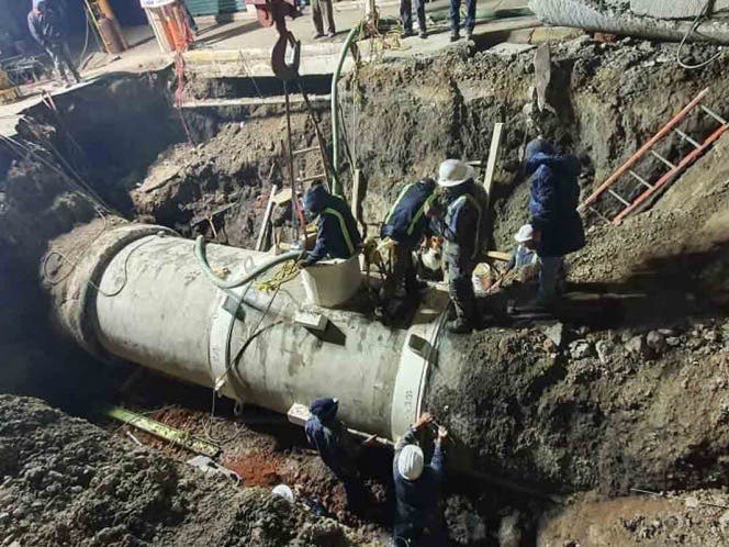 El personal coordinado por Conagua laboró de manera ininterrumpida en la excavación, desalojo de agua, sustitución de tuberías, colocación de piezas especiales, limpieza del área afectada y traslado de equipos y materiales.