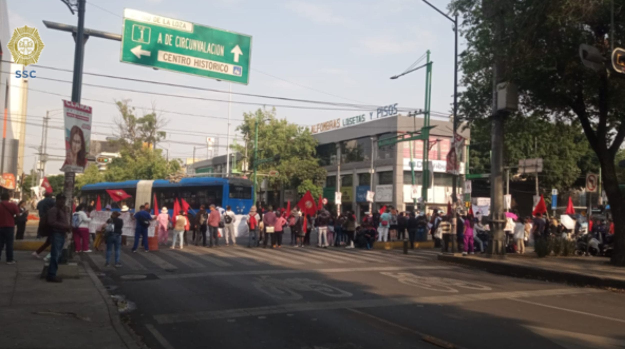 Integrantes de la Coordinadora de Trabajadoras y Trabajadores de la Ciudad de México bloquean en este momento la intersección de Eje Central y Avenida Fray Servando y Teresa de Mier , en la alcaldía Cuauhtémoc.