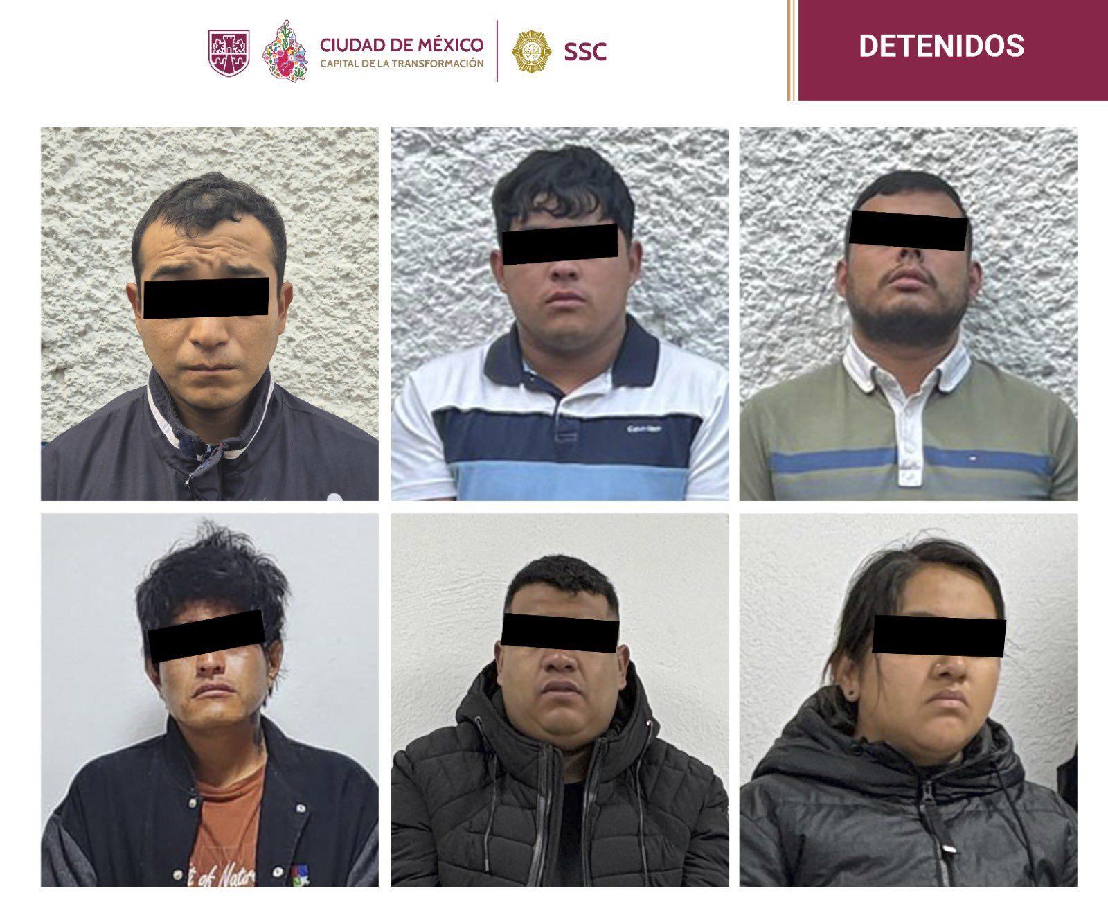 La Secretaría de Seguridad Ciudadana (SSC) en colaboración con la Fiscalía General de Justicia (FGJ), la Secretaría de Defensa Nacional, la Secretaría de Marina, la Guardia Nacional (GN) y el Centro Nacional de Inteligencia, tras llevar a cabo operativos en las alcaldías Venustiano Carranza y Cuauhtémoc, detuvieron a seis presuntos integrantes de la Unión Tepito, organización criminal que opera principalmente en el centro de la ciudad, en materia de venta de drogas, extorsión, secuestros, entre otros.