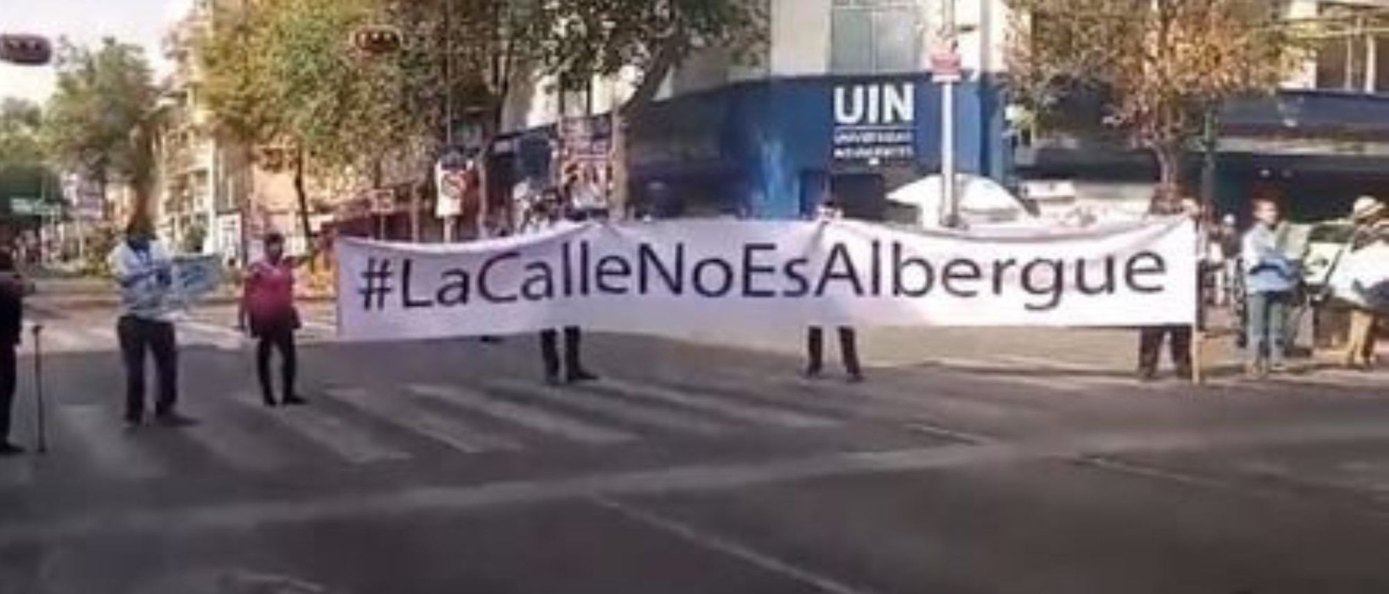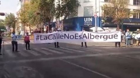 Manifestantes cargan pancartas de distintos colores con la frase: “La calle no es albergue” para pedir a las autoridades para que tomen acción en el asunto y atiendan la problemática de los indocumentados, quienes no tienen ningún lugar para solventar sus necesidades básicas.