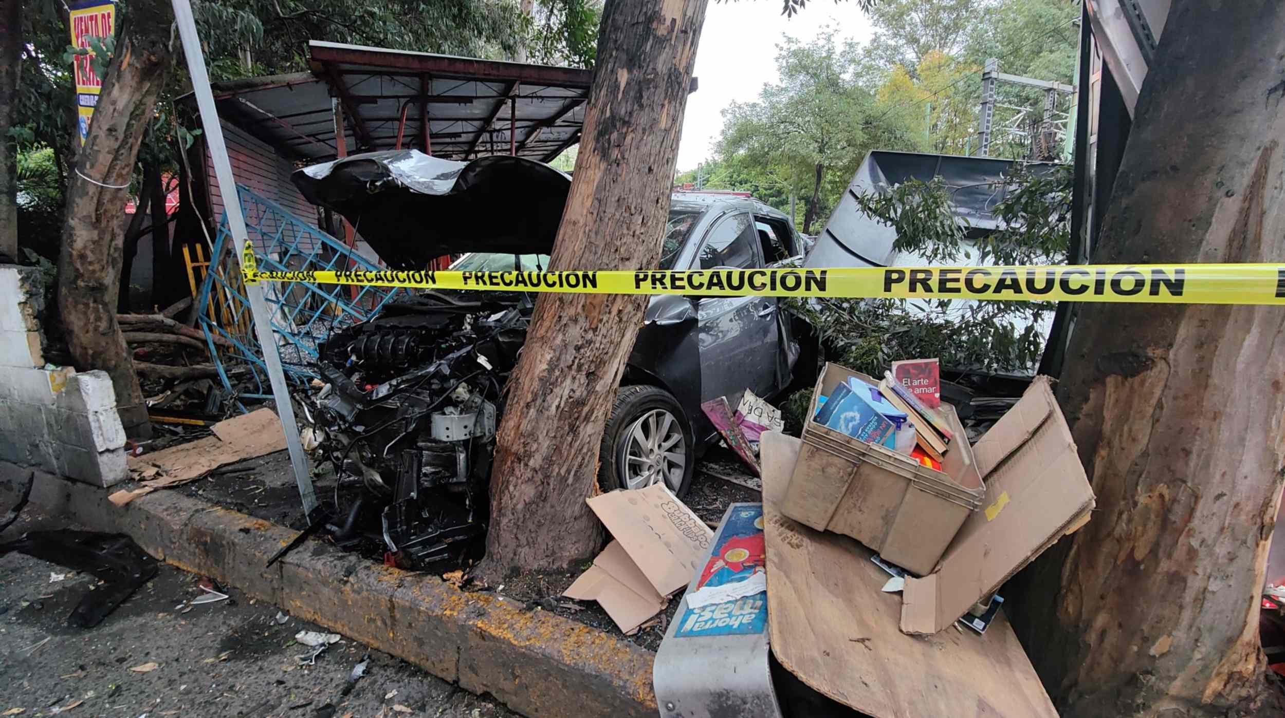 Ciudad de México.- El conductor de un Sentra gris se impactó contra un parabús y un puesto de periódicos y revistas a la altura de la calle Luis Murillo, en la colonia Bosques de Tetlameya, en Calzada de Tlalpan, alcaldía Coyoacán.