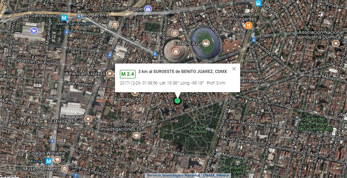SISMO Magnitud 2.4 Loc. 3 km al SUROESTE de BENITO JUAREZ, DF 29/12/17 01:38:56 Lat 19.38 Lon -99.18 Pf 3 km