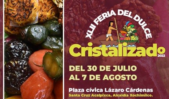 Ciudad de México.- La Feria del Dulce Cristalizado de Xochimilco realizará su XLII edición tendrá lugar del 30 de julio al 7 de agosto de 2022 en la Plaza Cívica Lázaro Cárdenas, localizada en el pueblo de Santa Cruz Acalpixca.