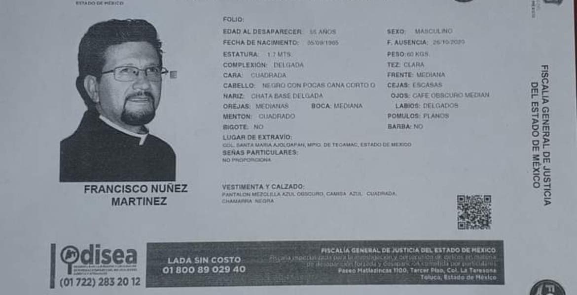 Ciudad de México.- La Fiscalía General de Justicia del Estado de México (FGJEM) activo un boletín de urgencia para localizar a Francisco Núñez Martínez de 55 años, quien despareció el pasado 26 de octubre en la colonia Santa María Ajoloapan, municipio de Tecámac.