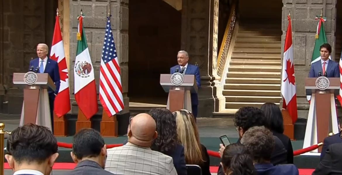 Ciudad de México.- Con una hora y 33 minutos de retraso empezó el mensaje con los representantes de los medios de comunicación en Palacio Nacional, donde el presidente Andrés Manuel López Obrador y sus homólogos de Estados Unidos y Canadá, Joe Bien y Justin Trudeau, respectivamente, expusieron los acuerdos logrados en esta X Cumbre de Líderes de América del Norte. Según el tabasqueño se logró la creación de un comité conjunto destinado a la planeación y a la sustitución de importaciones en esta región del mundo.
