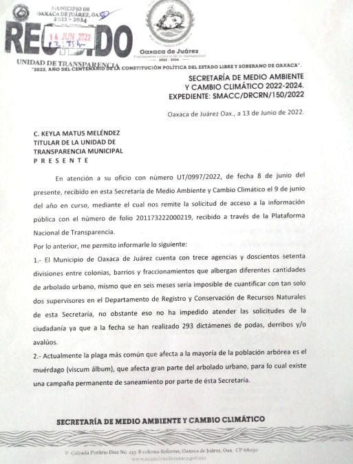Según la Plataforma Nacional de Transparencia, el municipio indicó que solo cuenta con 2 supervisores del Departamento de Registro y Conservación de Recursos Naturales, detalló que la plaga que mas afecta a los arboles de la capital oaxaqueña es el muérdago.