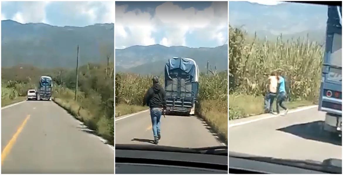 Otro sujeto baja al conductor del camión y lo lleva a la orilla del camino, mientras, el segundo coche se acerca a la escena. Para que nadie se dé cuenta de lo que pasa, esconden a la víctima entre la maleza y el primer auto se pone enfrente del camión para no invadir el carril del sentido contrario.