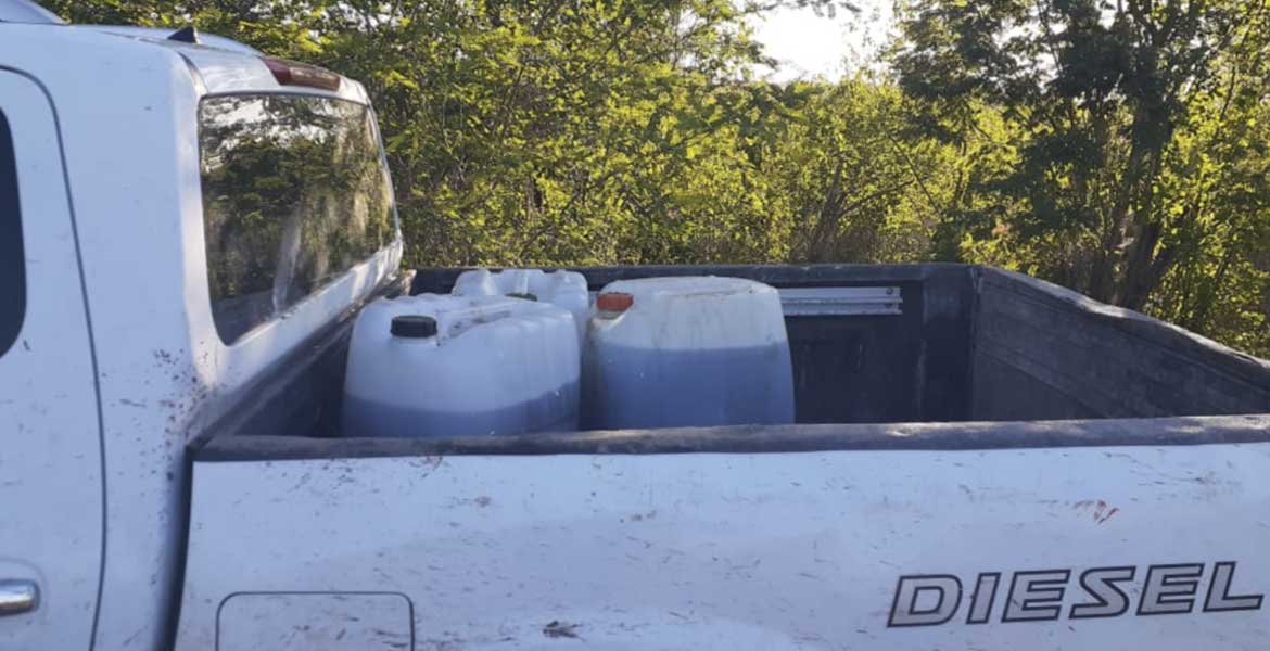 Ante este escenario, llevaron a cabo una revisión al área de carga de la unidad, ahí encontraron tres bidones de aproximadamente 50 litros cada uno, los cuales contenían un líquido color café con aroma a químico, el cual coincide con las características propias de la droga denominada metanfetamina.