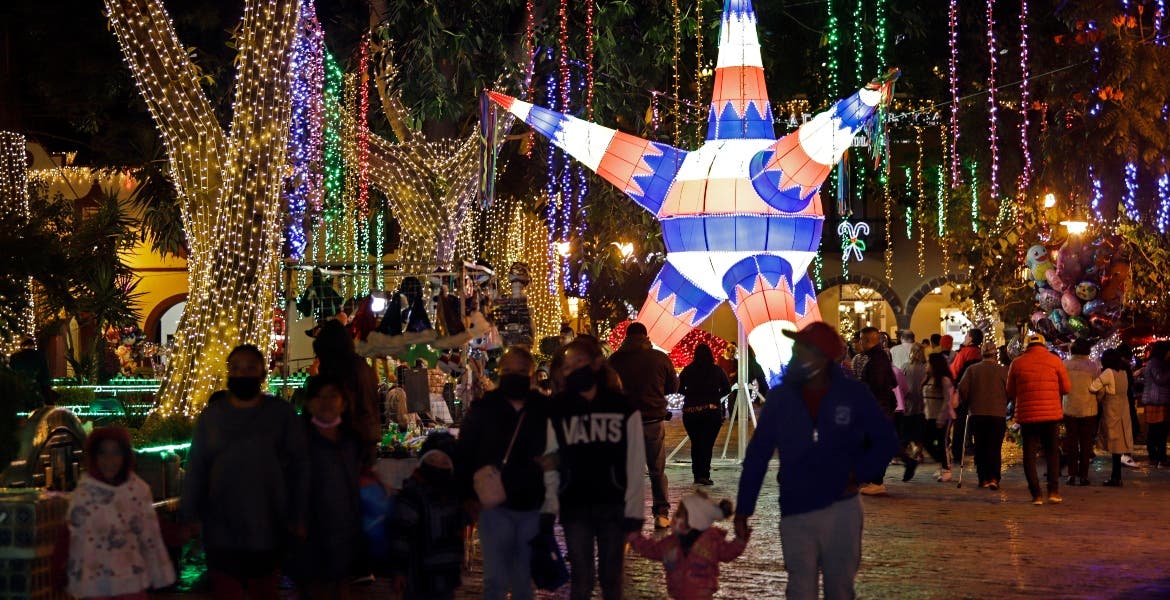 A escasos 50 metros de distancia se ubica la Avenida Hidalgo, la cual guía a los visitantes durante su recorrido con miles de luces colgadas y faroles que hacen recordar que la época navideña debe ser colorida y alegre, donde se encuentra la tradicional posada y se ve un niño pegándole a la piñata acompañado de otros niños, esperando los dulces.