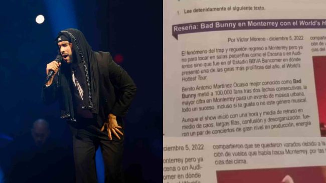 Numerosas cuentas de Facebook, Instagram y X difunden dos fotos de supuestas actividades escolares en los ejemplares de la SEP: una implica el análisis del video musical "El Apagón", de Bad Bunny, y la otra, ejemplifica la reseña escrita con una nota periodística sobre un concierto del artista en 2022.