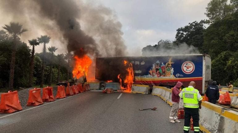 Ciudad de México.- La autopista México-Cuernavaca está cerrada en ambos sentidos luego que un tráiler se accidentó en el kilómetro 69 y empezó a incendiarse.