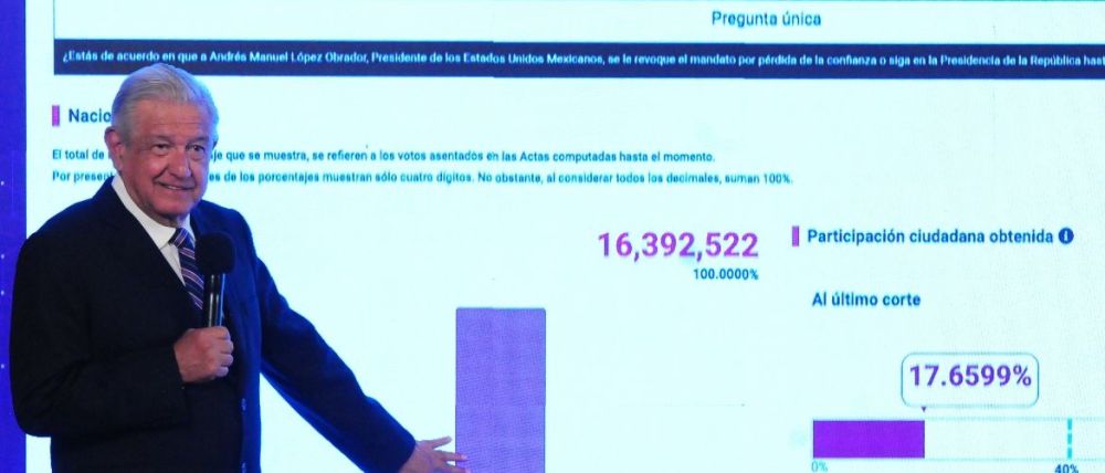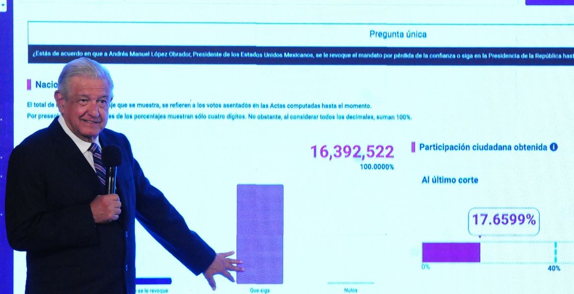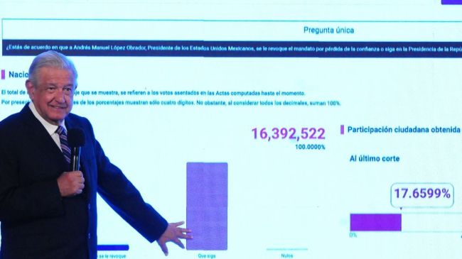 Refirió que, con el 99.32 por ciento de las casillas computadas, de los 16 millones 392 mil 522 votos registrados en la consulta de revocación de mandato, 15 millones 60 mil 746 fueron para que siga en el cargo; es decir, 143 mil 819 más que los que anotó en 2006 Calderón Hinojosa y el PAN.