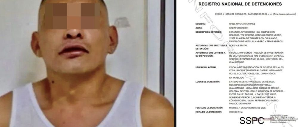 Según el Registro Nacional de Detenciones, Uriel “N” fue puesto a disposición del Ministerio Público y se encuentra en la Fiscalía de Investigación de Delitos Sexuales en la colonia Doctores, alcaldía Cuauhtémoc.