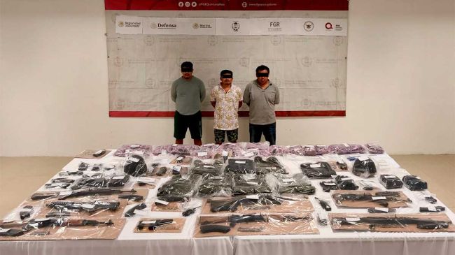 Señalaron que entre ellos se ubicó a José Benjamín Hau Herrera, alias 'El Cuervo', líder regional de las operaciones de este grupo en Tulum, además de Fernando 'N', alias 'El Gavilán' y Carlos Manuel 'N', alias 'El Barni', a quienes les decomisaron nueve armas de fuego, 49 cargadores, una granada, dos cascos balísticos, ocho chalecos tácticos y cuatro kilos de marihuana.
