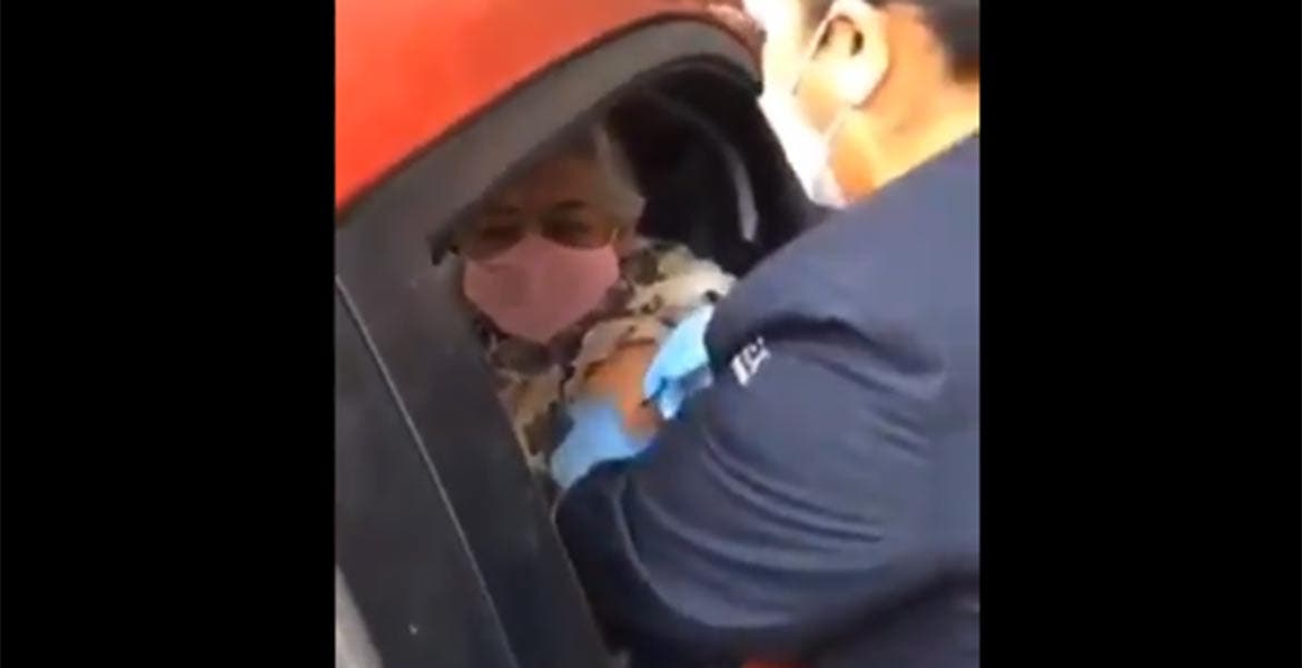 En el video se observa cómo una mujer de la tercera edad llega a bordo de un vehículo para recibir la dosis. Una enfermera se acerca al automóvil con la jeringa aparentemente preparada, pincha el brazo de la abuelita, pero no se observa que empuje el émbolo para introducir el biológico.