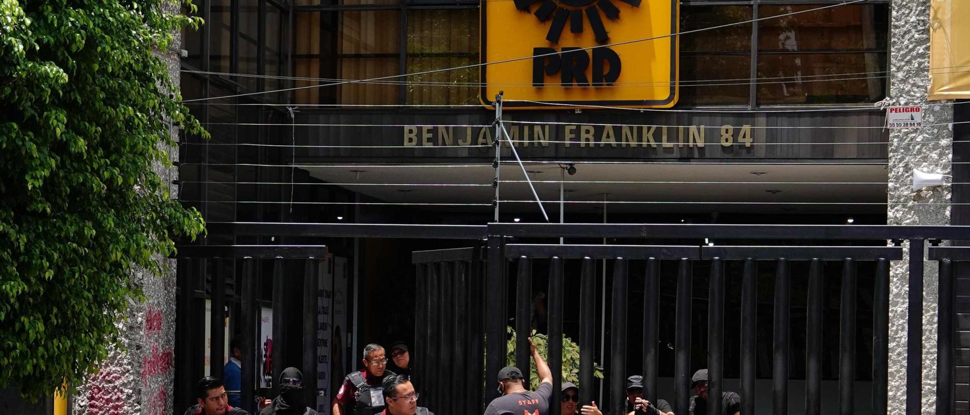 Ciudad de México.- Supuestos elementos de seguridad privada resguardan el edificio del PRD ubicado en la Avenida Benjamin Franklin 84, colonia Escandón I Sección, alcaldía Miguel Hidalgo, cuyo inmueble fungía como sede nacional.