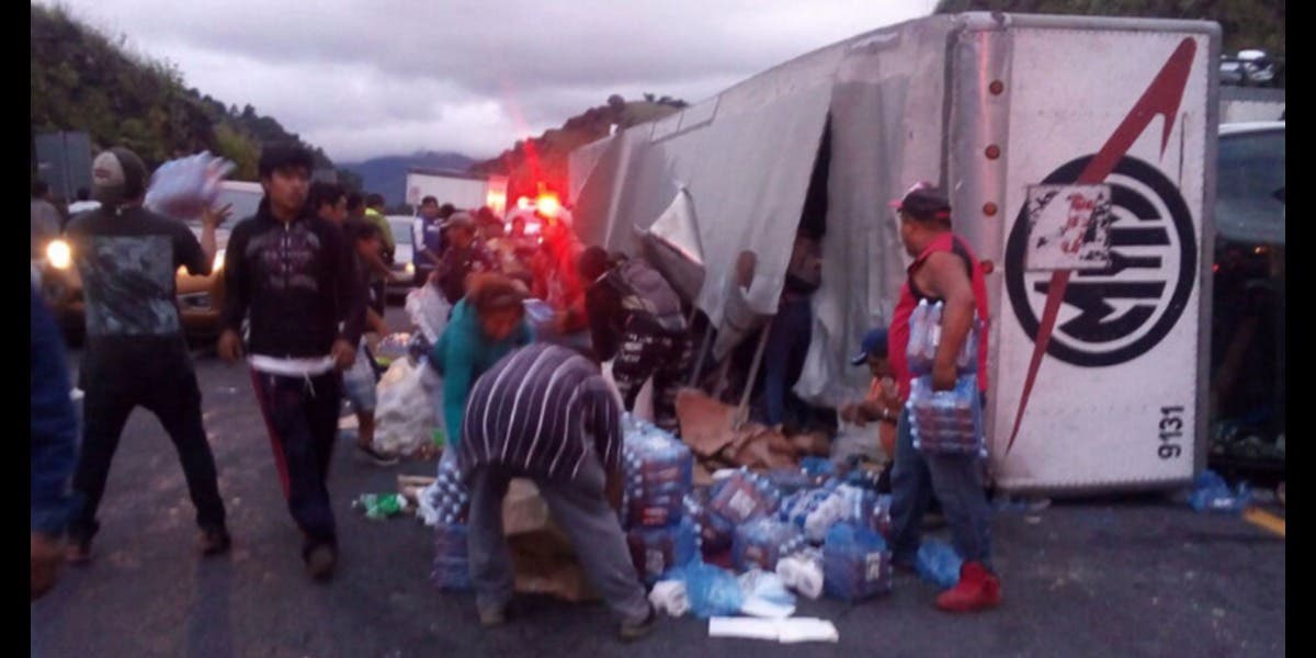 Un tráiler que traslada víveres para los damnificados de Juchitán, Oaxaca, volcó sobre la carretera Puebla-Orizaba, sin embargo, pobladores y personas que transitaba por la zona conocida como la Balastrera robaron por completo la carga.