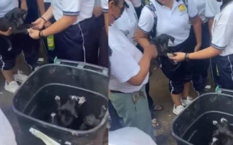 En otra grabación se puede ver a un grupo de estudiantes alrededor de un bote de basura, donde se encuentran dos cachorros intentando salir. Afortunadamente, fueron rescatados y uno de ellos fue cargado por una estudiante.