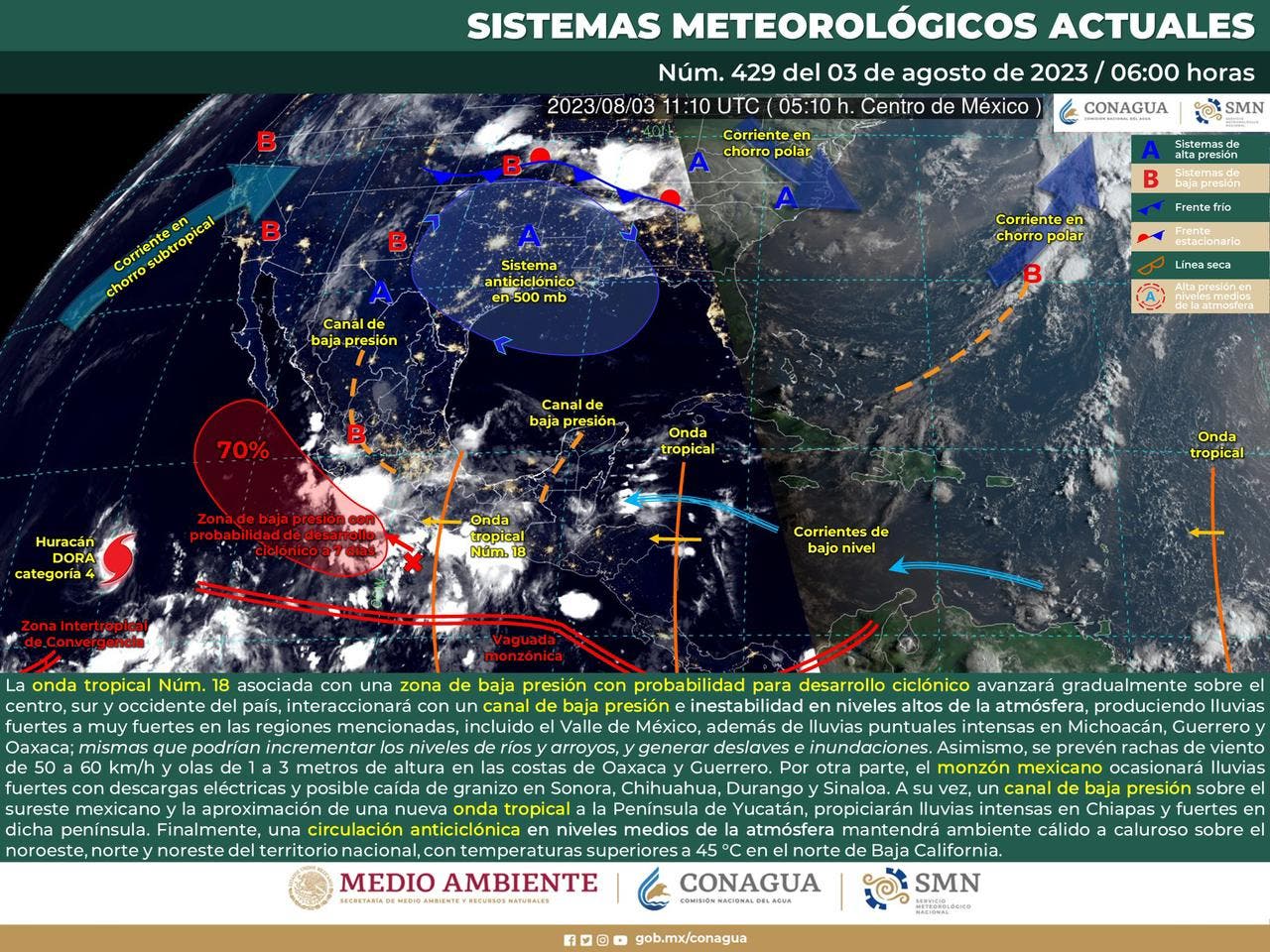 Oaxaca de Juárez.- La Coordinación Estatal de Protección Civil y Gestión de Riesgos (CEPCyGR) informa sobre la actividad de la onda tropical número 18, la cual dejará lluvias fuertes, actividad eléctrica y rachas de viento en el estado acoplándose con un canal de baja presión en el centro del país, lo anterior debido al pronóstico del tiempo emitido por la Comisión Nacional del Agua (Conagua).