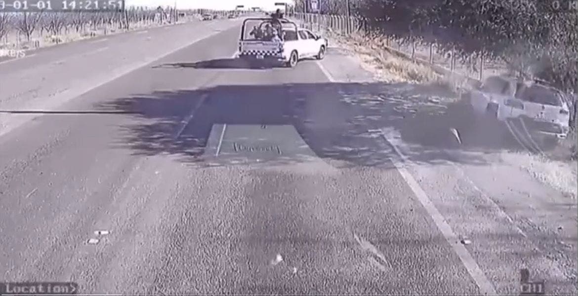 El clip grabado por un tráiler que circulaba en carretera Jiménez-Torreón, captó también a un hombre salir corriendo de la zona, se desconoce si iba en la unidad atacada por la dependencia.