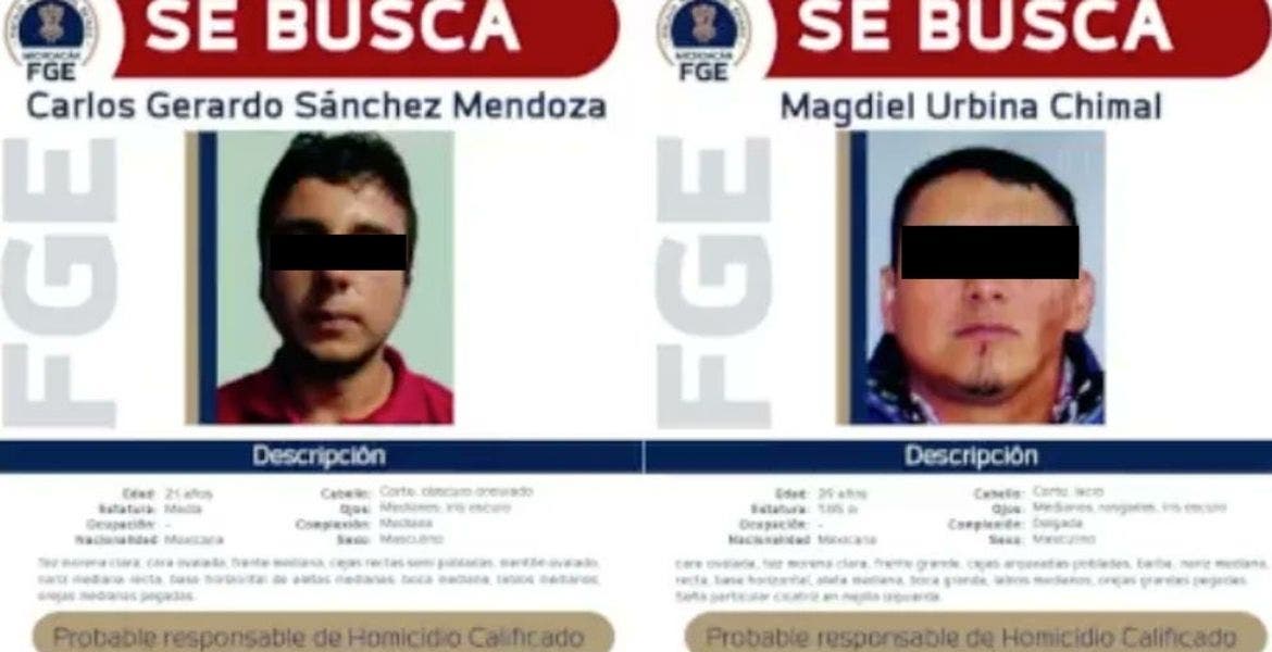 El fiscal reveló que los dos presuntos asesinos fueron identificados como Carlos Gerardo Sánchez Mendoza y Magdiel Urbina Chimal, de 21 y 39 años de edad, respectivamente, en contra de quienes ya existen órdenes de arresto por el delito de homicidio calificado.