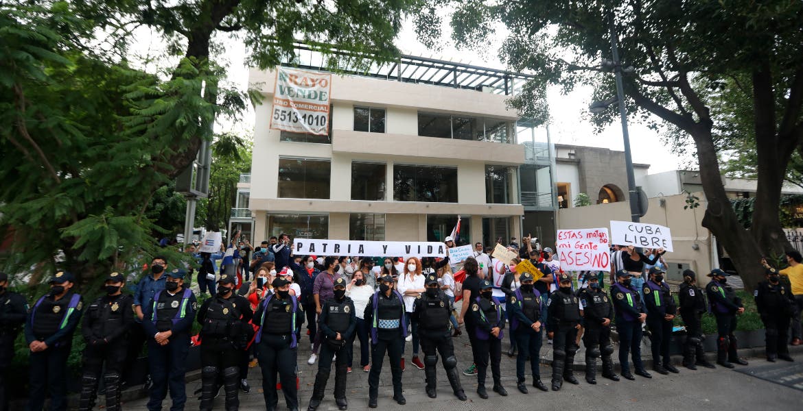 La representación de La Habana en México es escenario de protestas desde el domingo, cuando miles de cubanos protestaron en la isla contra el Gobierno al grito de "¡libertad!", en una jornada inédita que terminó con cientos de detenidos y enfrentamientos azuzados por Díaz-Canel.