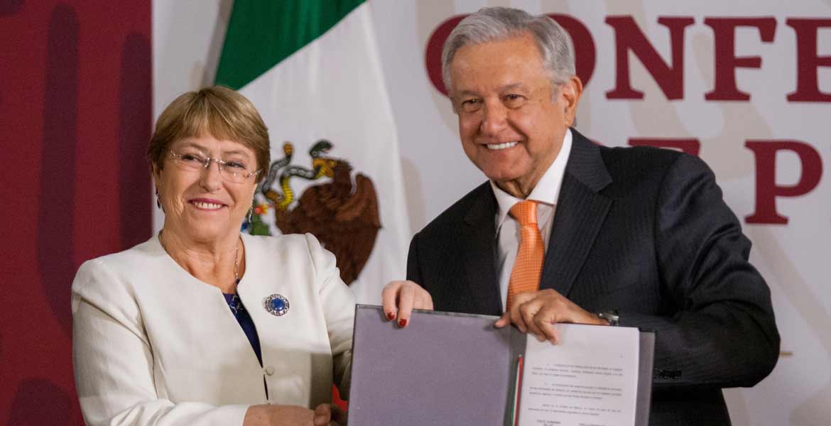 La expresidenta de Chile acudió esta mañana a la conferencia matutina de López Obrador para formalizar el acuerdo que pone a disposición las oficinas de la ONU en México para brindar asesoría y asistencia técnica en materia de derechos humanos para la constitución del nuevo cuerpo de seguridad.
