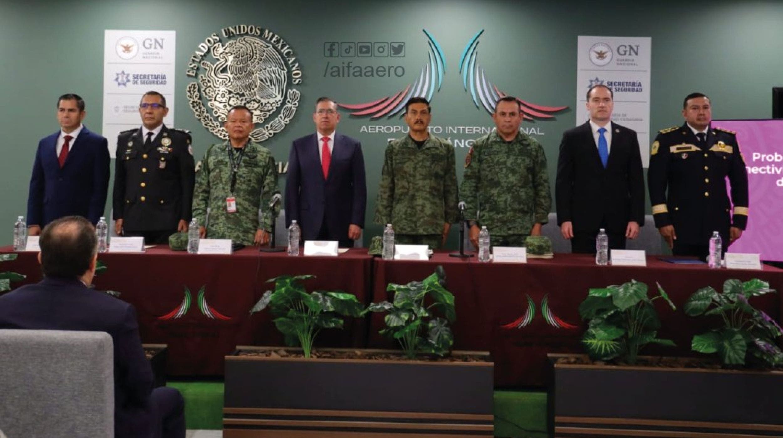 Salvador Cruz Neri, secretario de Seguridad Pública de Hidalgo; Rodrigo Martínez Celis-Wogau, su homólogo en el Edomex; Francisco Moreno Montaño, subsecretario de Control de Tránsito de la Secretaría de Seguridad Ciudadana de la Ciudad de México; Isidoro Pastor Román, director del AIFA; y David Córdova Campos, comandante de la Guardia Nacional, firmaron el acuerdo.