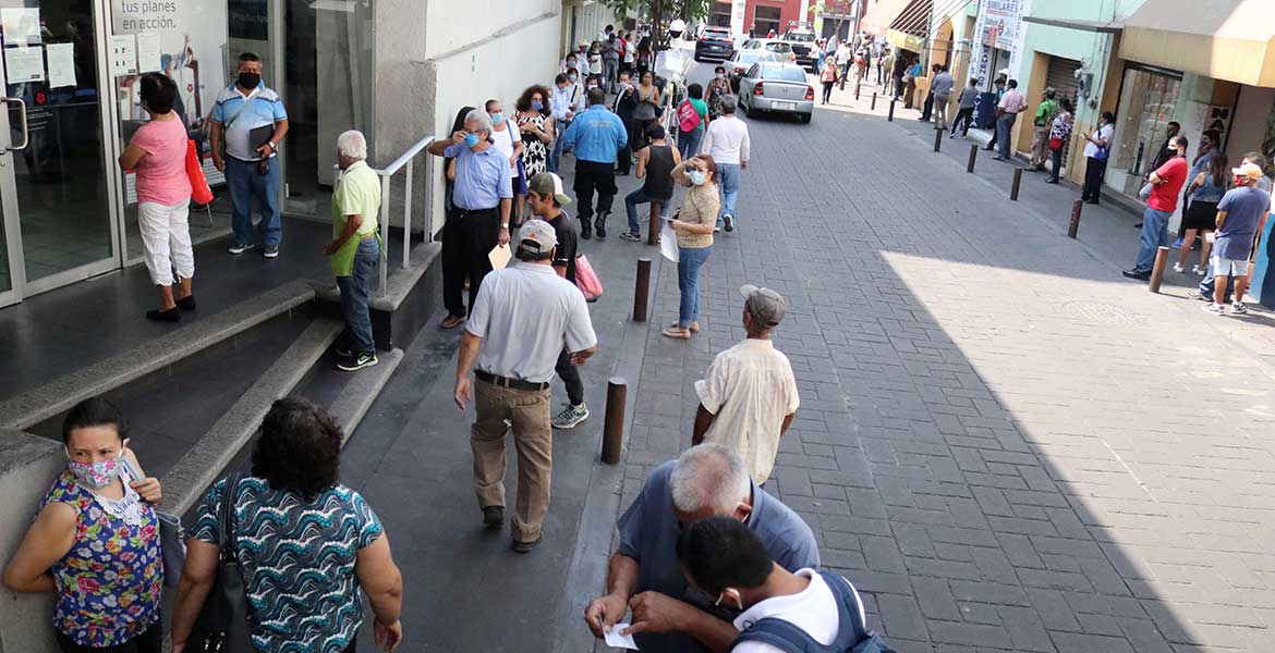 Este lunes decenas de cuentahabientes de bancos hacían grandes filas sin respetar el metro y medio entre uno y otro que las autoridades han anunciado en reiteradas ocasiones para evitar contagios por Covid-19.