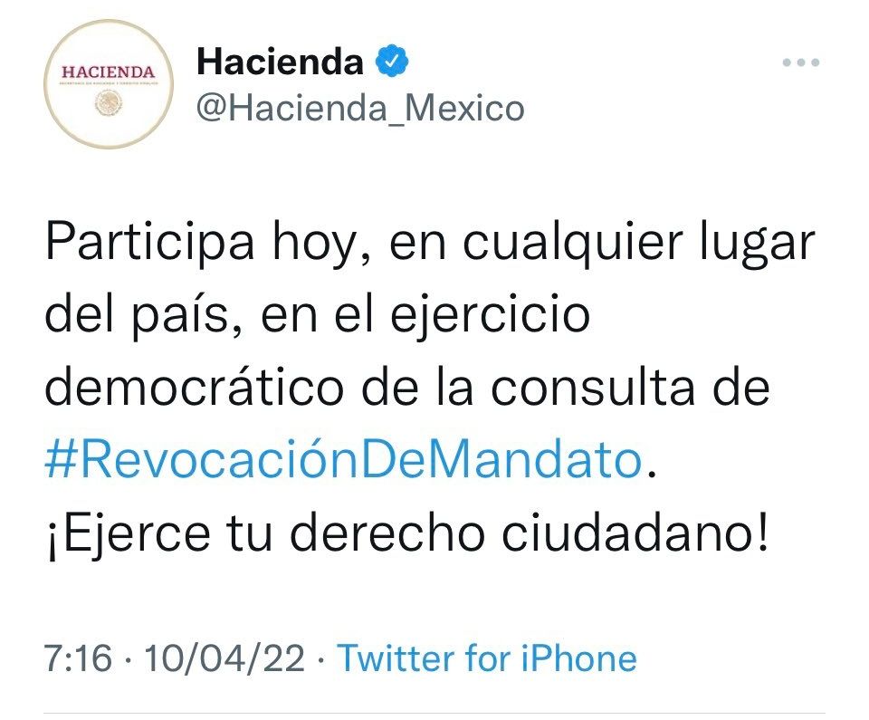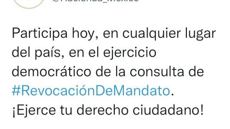 De manera oficiosa, el INE instauró un procedimiento en contra de la Secretaría de Hacienda y Crédito Público, derivado de una publicación en la cuenta oficial verificada en Twitter de dicha Secretaría, donde invita a la ciudadanía a participar en el proceso de Revocación de Mandato.