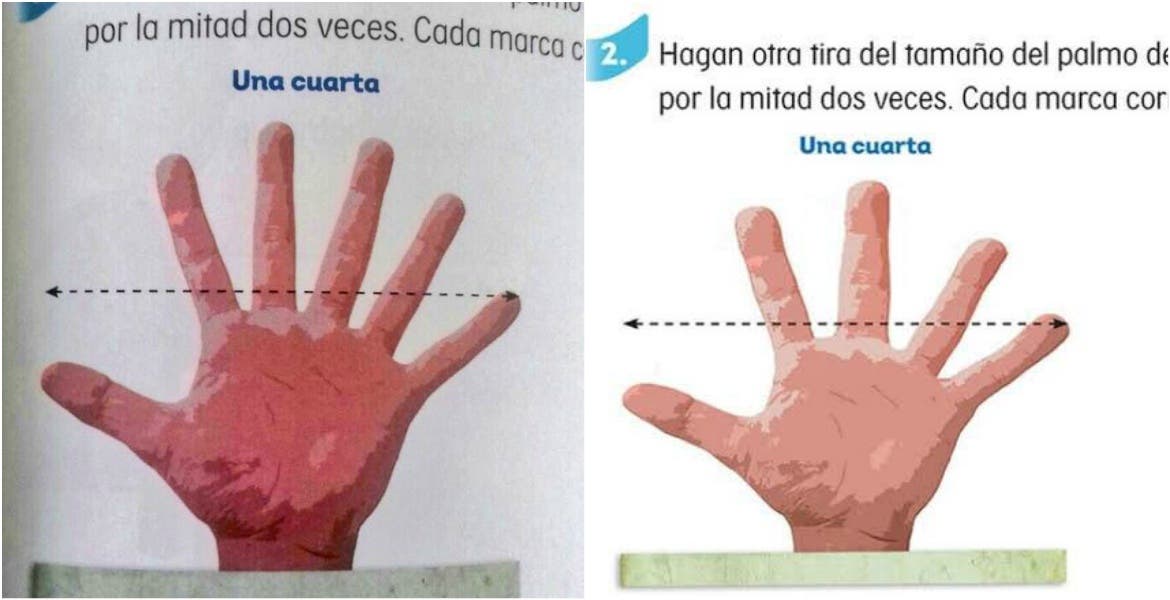 La imagen que aparece en la página 161 del libro de matemáticas para segundo grado y su propósito es explicar medidas de longitud no convencionales como cuarta, palmo o dedo; por lo que la institución se defendió al decir que ello no implica un “error conceptual ni didáctico en el tratamiento del tema”.