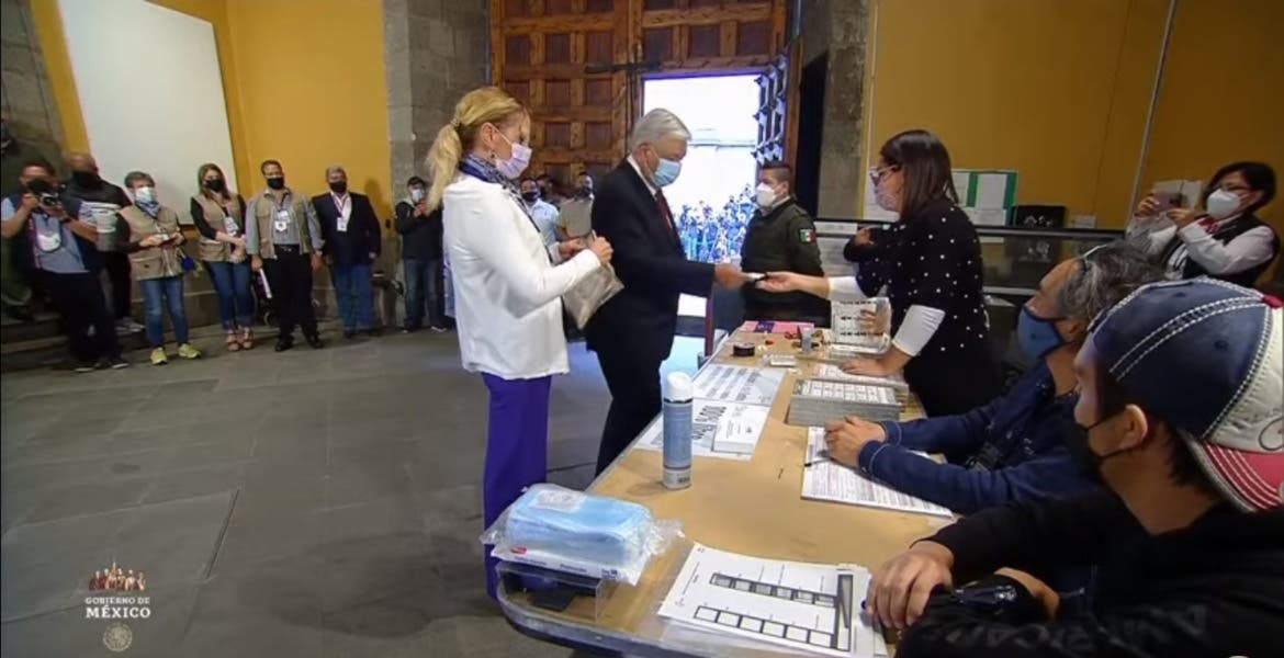 López Obrador acudió a ese sitio en compañía de su esposa Beatriz Gutiérrez Müller y pese a que ambos salieron sin cubrebocas, se lo colocaron momentos antes de entrar al centro de votación.