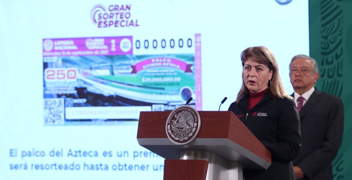 "El palco del Estadio Azteca lo consideramos un premio especial. Va a ser para un solo ganador, tiene una vigencia de uso hasta 2065 e incluye el mantenimiento del palco por 10 años", informó en la matutina de este miércoles Margarita González Saravia, directora general de la Lotería Nacional (Lotenal).