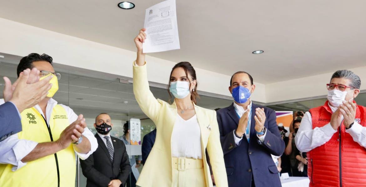 A su registro la acompañaron los dirigentes nacionales del PAN, Marko Cortés, el dirigente estatal del PRD, Omar Sarabia, y un delegado del Comité Ejecutivo Nacional del PRI.