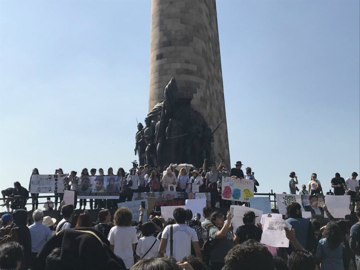 Los manifestantes que se reunieron en la Glorieta de los Niños Héroes que bautizaron como la “Glorieta de los Desaparecidos”. El presidente de la Federación de Estudiantes Universitario (FEU), Jesús Medina, explicó la ciudadanía vive con una herida abierta y por eso es el cambio de nombre.